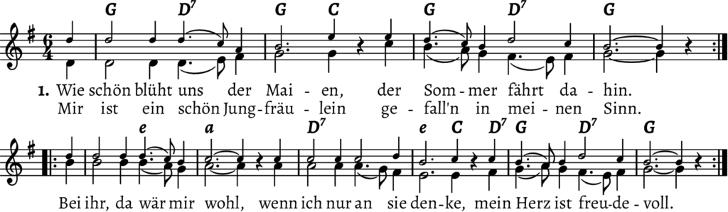Ich nutze Lilypond schon länger, um Lieder zu setzen. Ein Beispiel dafür ist „Wie schön blüht uns der Maien“.